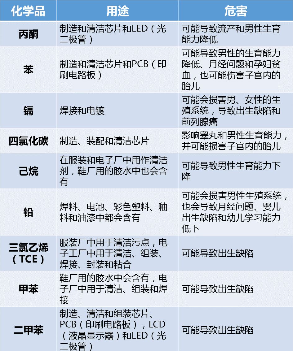 你在工作中会用到以下的化学品吗?如果有,你知道怎样保护自己吗?资料来源:《工作安全健康指南》、《工作因素与女性生殖健康》